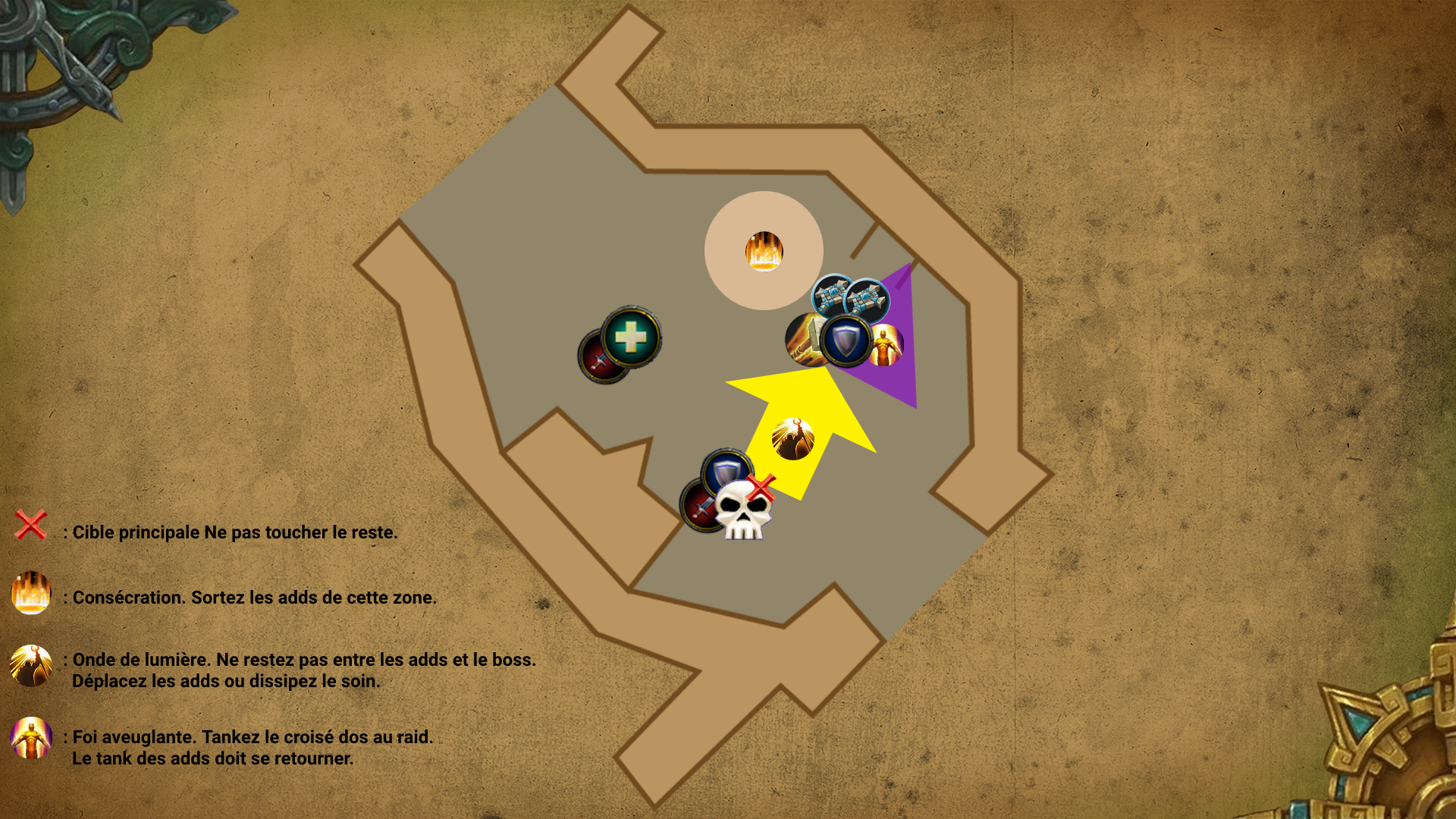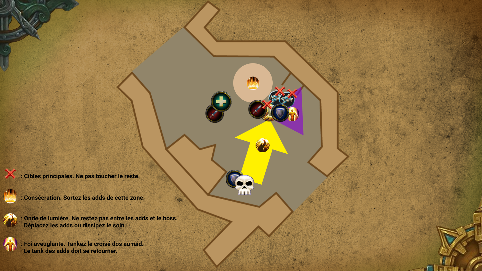 Les croisés posent des Consécrations dont il faut sortir tous les acolytes et utilisent Foi aveuglante. Tout le raid doit être placé à tout moment dos à l’add pour ne pas être désorienté. Le tank des adds devra se