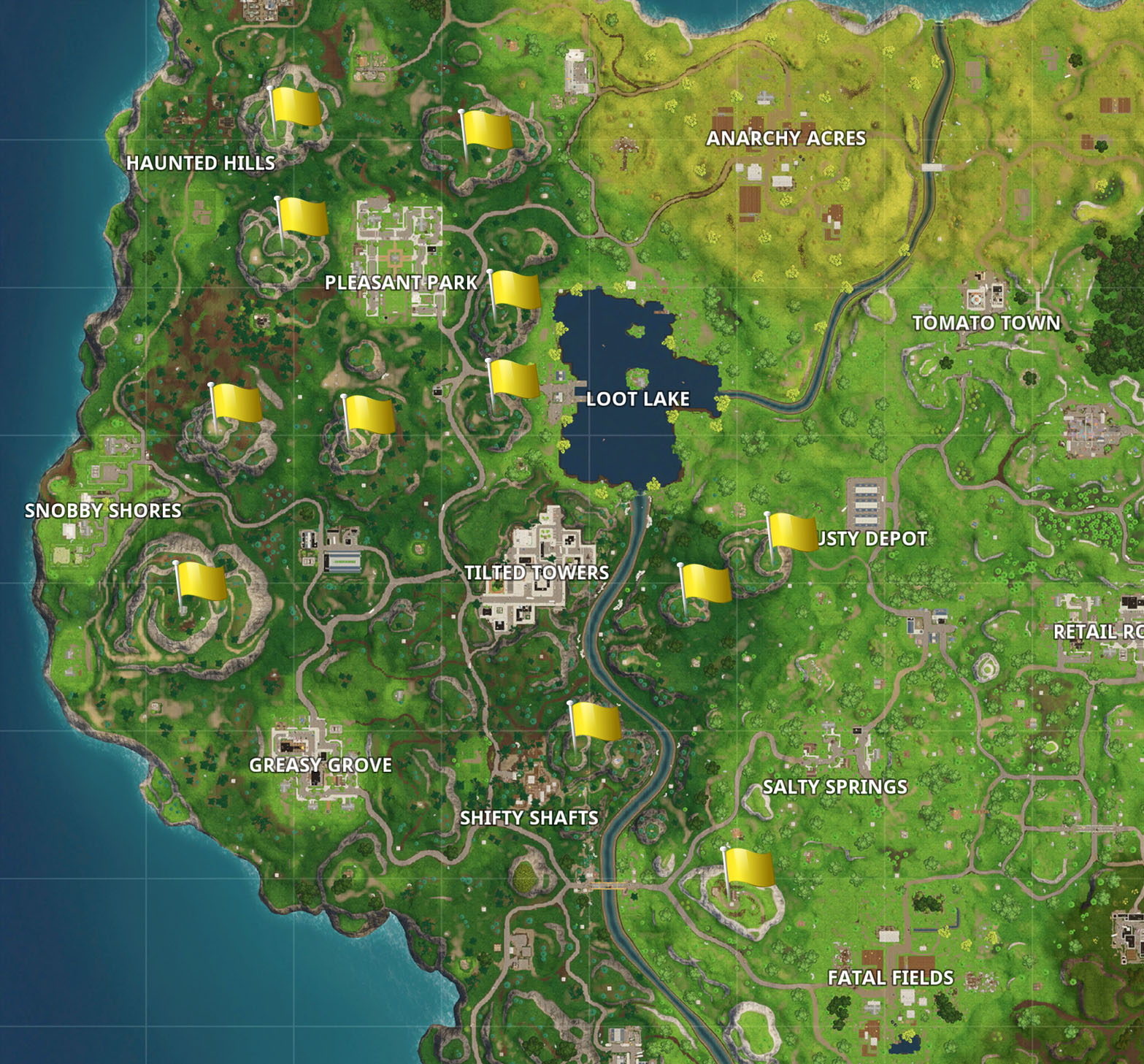 Pour l’un des 7 défis de la semaine, vous allez devoir escalader des montagnes et planter un drapeau au sommet. Retrouvez l’emplacement de certains drapeau à planter sur la carte ci-dessous.
