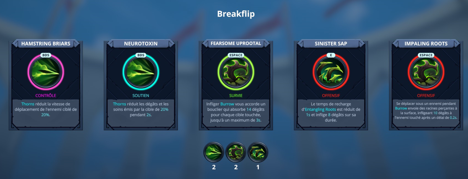 Root Claw : Frappe tout en infligeant 12/14/18 dégâts. Le troisième coup est un Root Grip qui inflige 18 dégâts, vous soigne de 8 points de vie et attire l’ennemi vers vous.