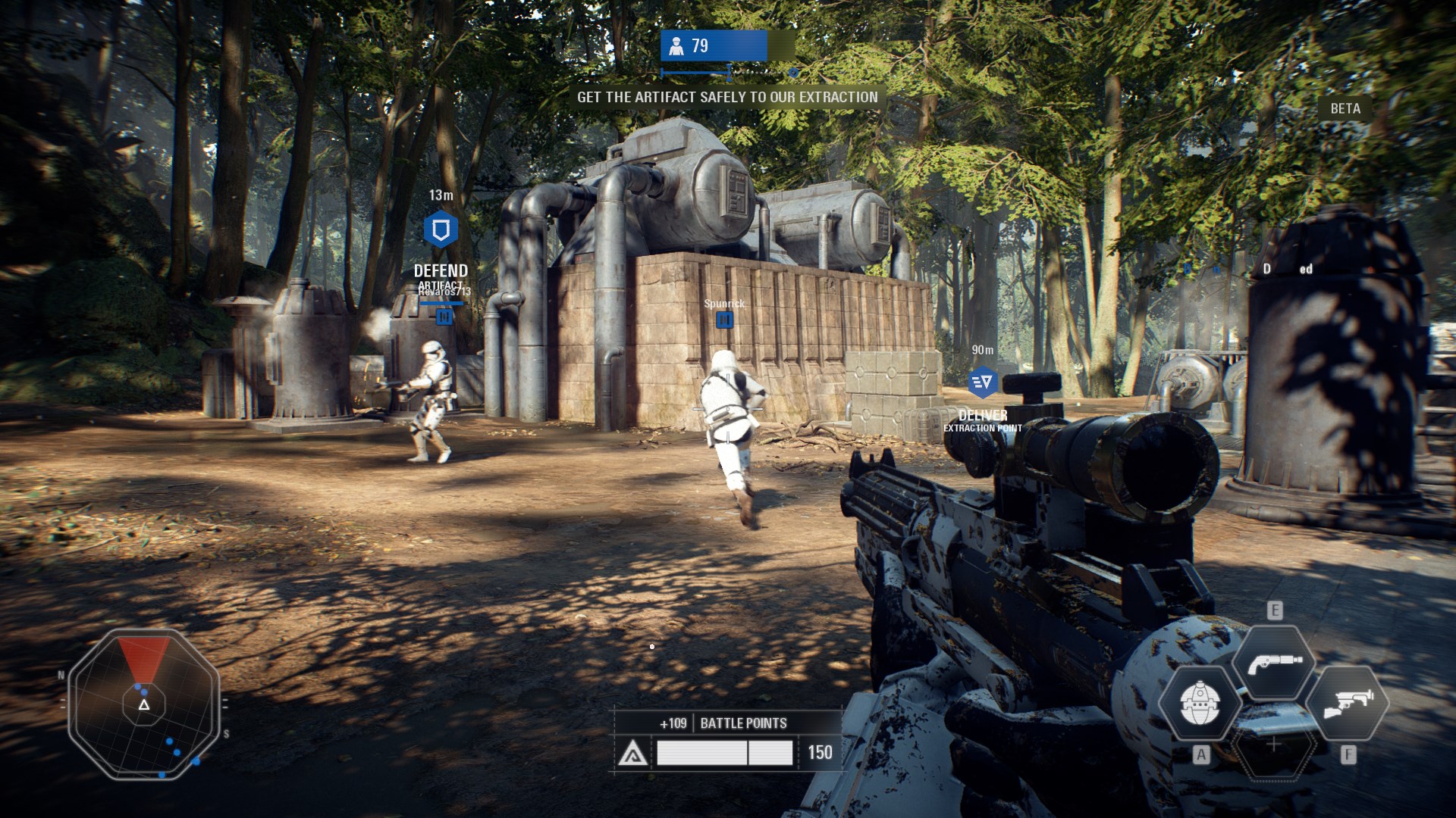 l’artefact, elle doit donc le ramener à son point d’extraction, mais si son porteur se fait tuer sur le chemin par un défenseur, les attaquants ont 1-2 minutes pour re-récupérer