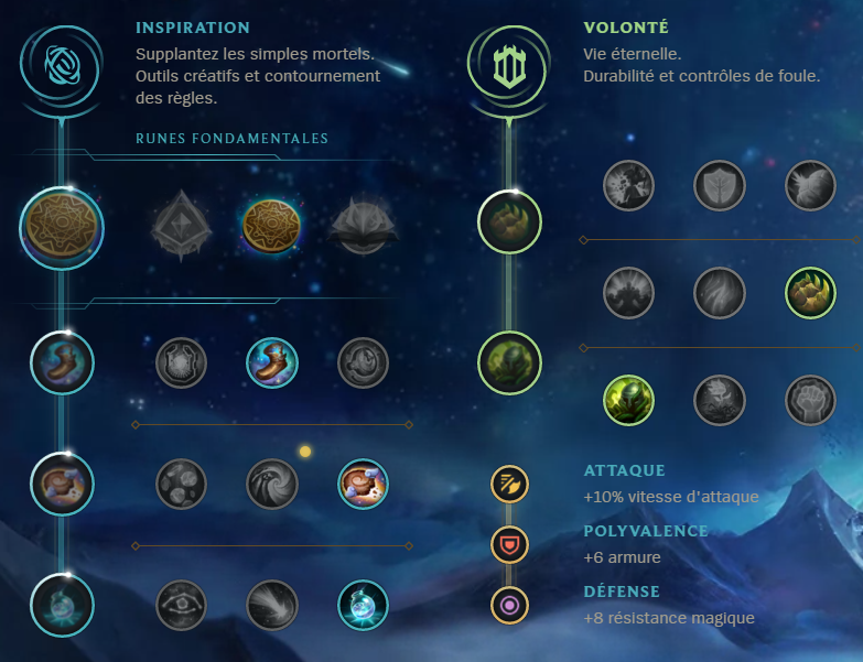La Lame enragée de Guinsoo quant à elle augmentera également votre vitesse d’attaque, mais aussi vos dégâts physiques et magiques. Son passif est également très intéressant et se Au bout du rouleau permet encore une fois d’augmenter la vitesse d’attaque de Kayle, mais confère surtout un bonus de résistance magique souvent important en midlane. En outre, Le Sablier de Zhonya vous permet de temporiser la pression adverse, mais également de prendre plus de risque sans pour autant être puni. |