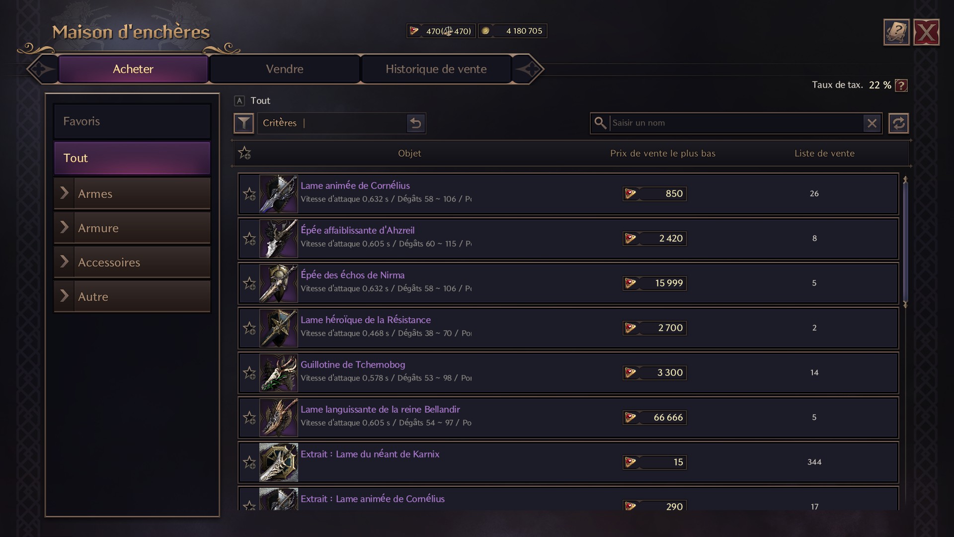 dans une interface dédiée disponible dans certaines grandes villes ou via le menu du jeu. Ils peuvent y naviguer à travers différentes catégories pour trouver des objets comme des armes, armures,