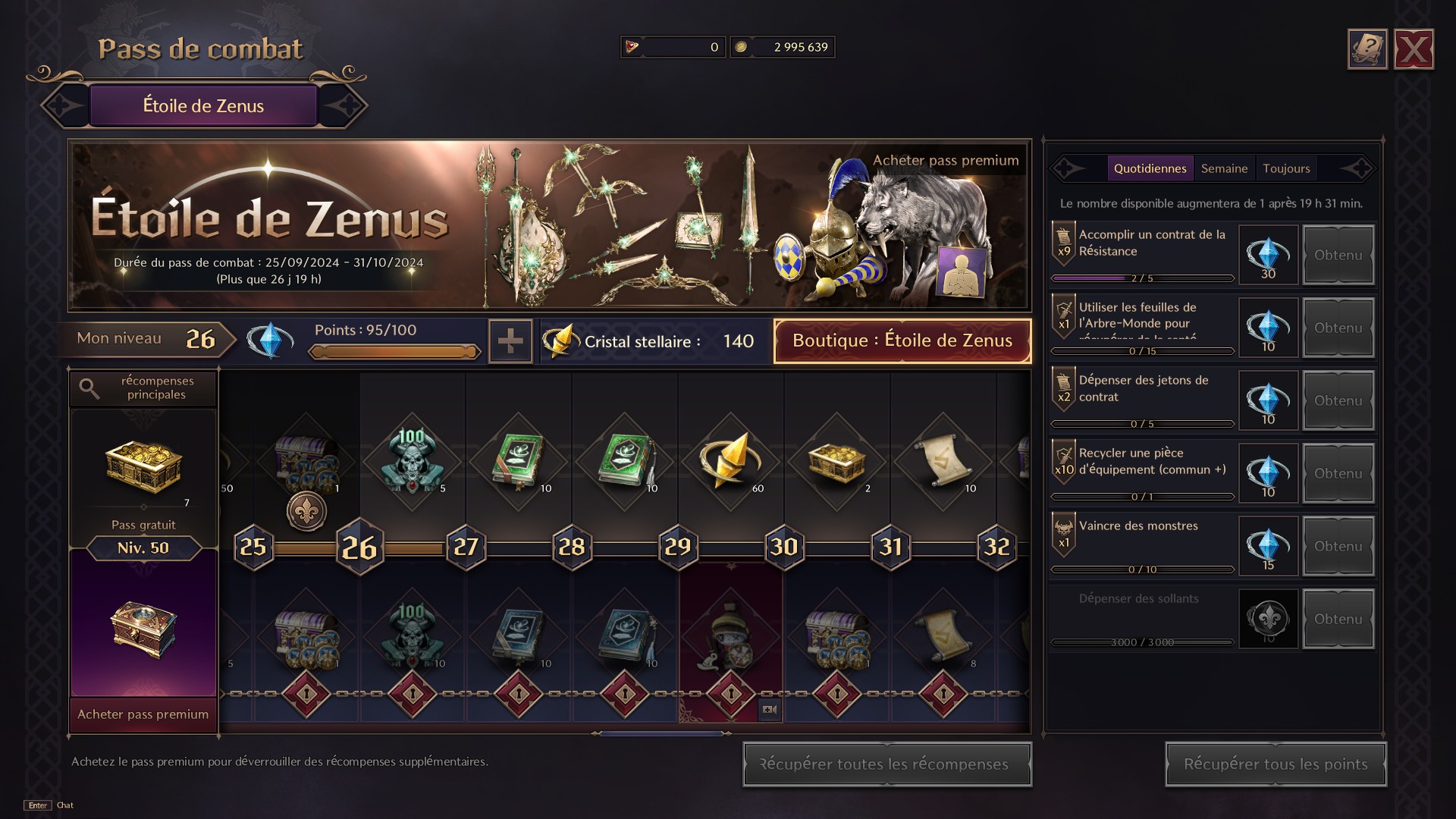 Dernière monnaie d’importance : les cristaux stellaires. C’est la monnaie principale liée au pass de combat. En effet, vous aurez une liste de tâche quotienne, hebdomadaire et