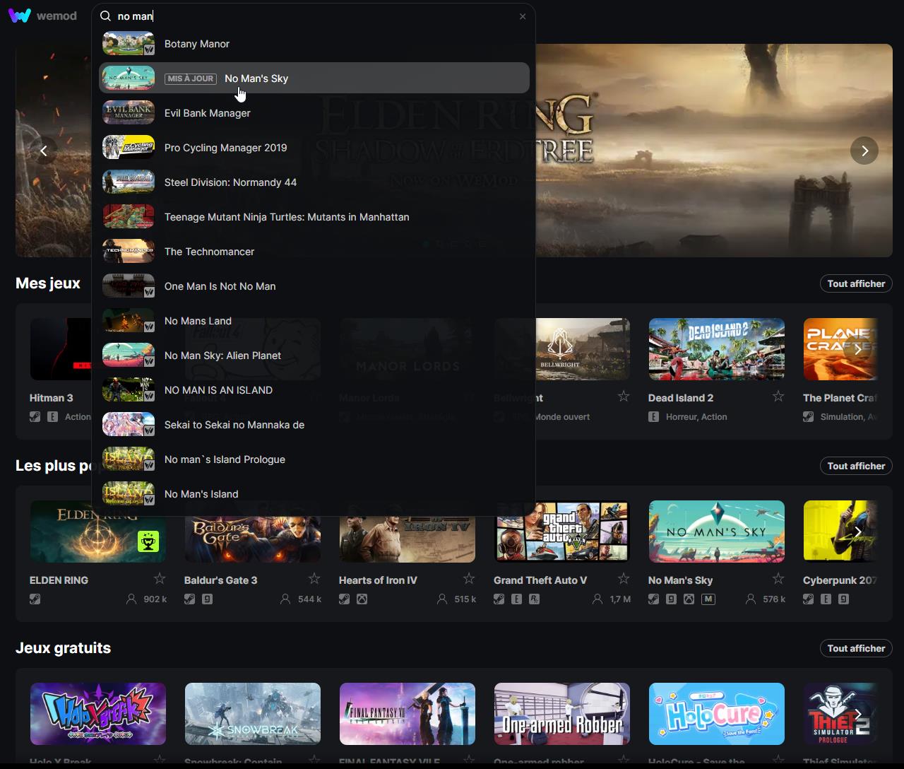 Une fois que vous avez téléchargé et installé WeMod, ouvrez-le. Cliquez ensuite sur Search game en haut à gauche et tapez No Man’s Sky. Il est possible qu’il soit aussi mis en