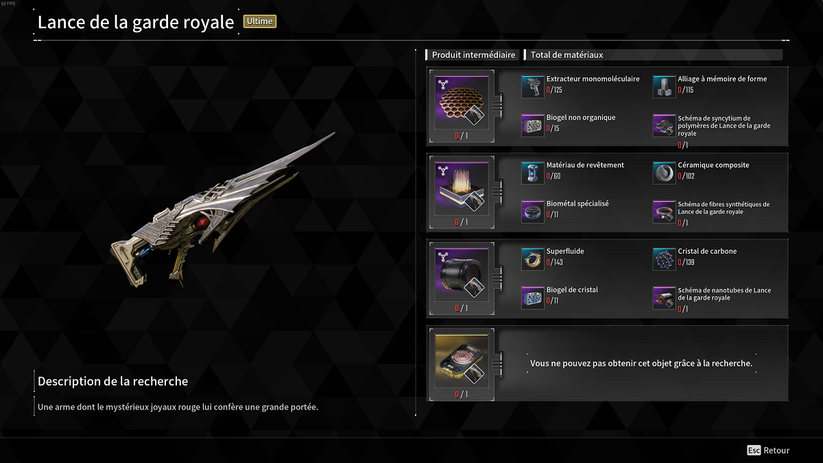 La Lance de la garde royale est une des armes uniques de The First Descendant qui est obtenable grâce à la recherche d’Anais. Voici ce qu’il vous faudra pour l’obtenir :