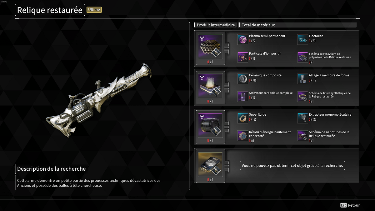 La Relique restaurée est une des armes uniques de The First Descendant qui est obtenable grâce à la recherche d’Anais. Voici ce qu’il vous faudra pour l’obtenir :