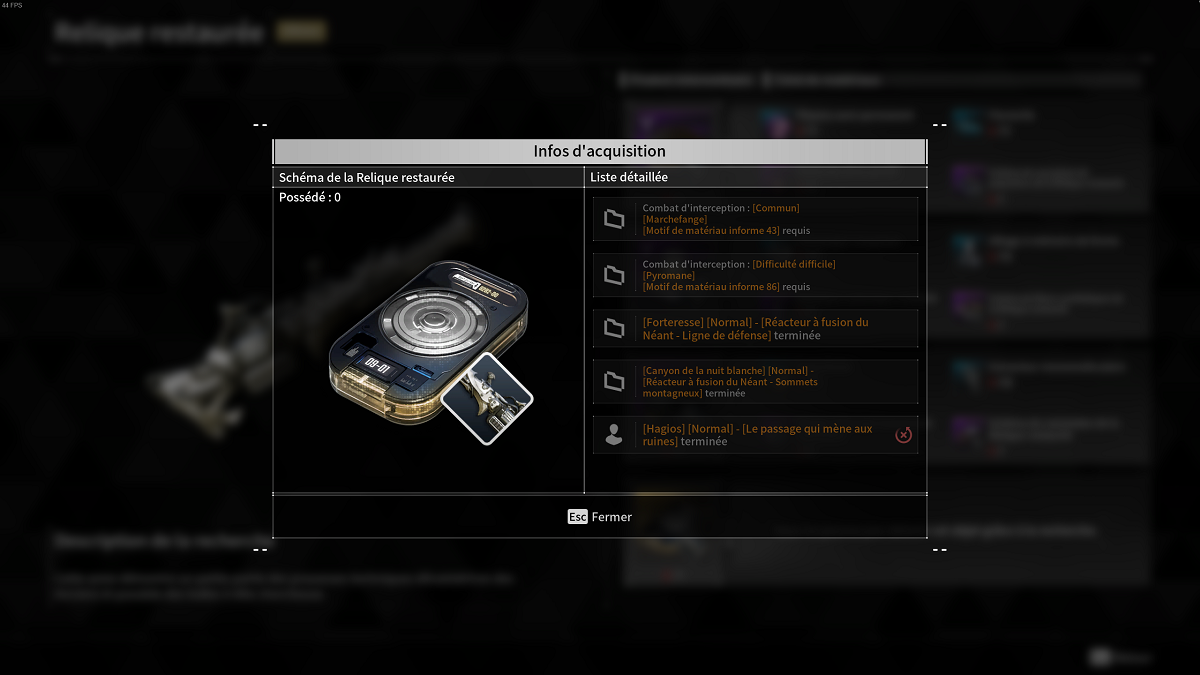 Tous les composants, hormis le schéma de la Relique restaurée, peuvent être craftés grâce à différents matériaux. Pour savoir comment les fabriquer, il vous suffit de mettre votre curseur dessus