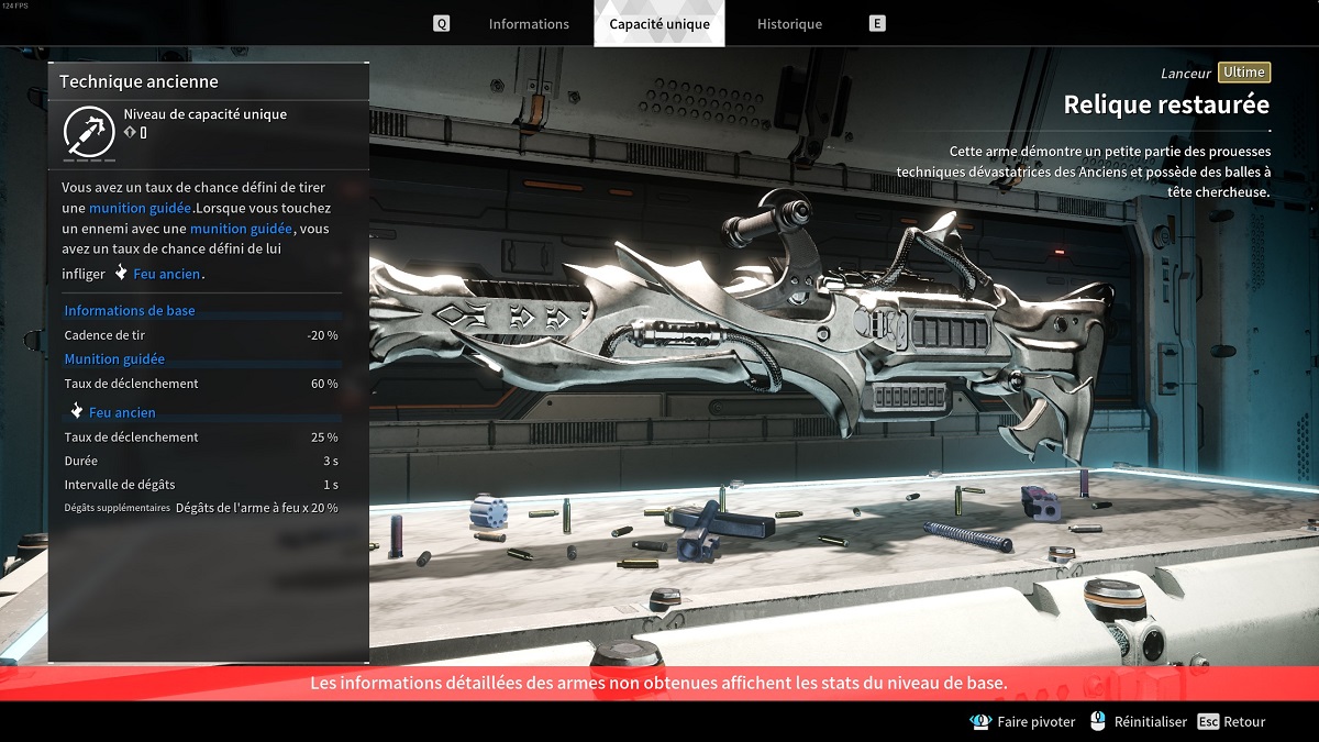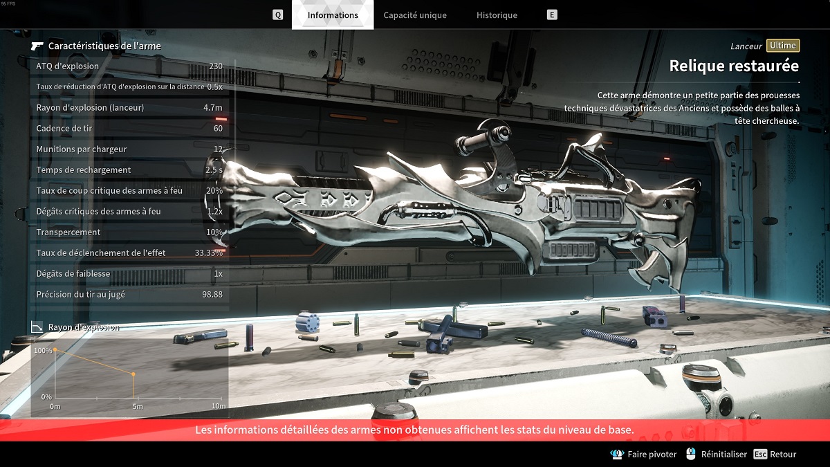 Bref, la Relique restaurée n’est pas super dur à obtenir, il vous faudra juste tout un tas de matériaux différents. Au niveau de ses statistiques, la Relique restaurée dispose d’un excellent Burst