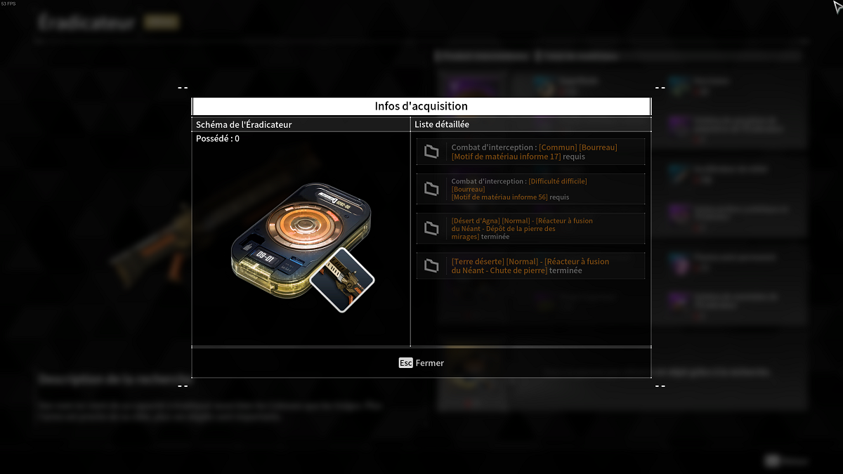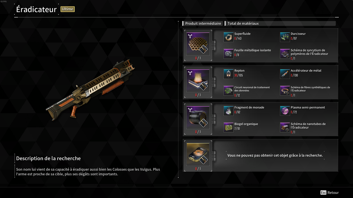 l’Éradicateur est une des meilleures armes de The First Descendant qui est obtenable grâce à la recherche d’Anais. Voici ce qu’il vous faudra pour l’obtenir :