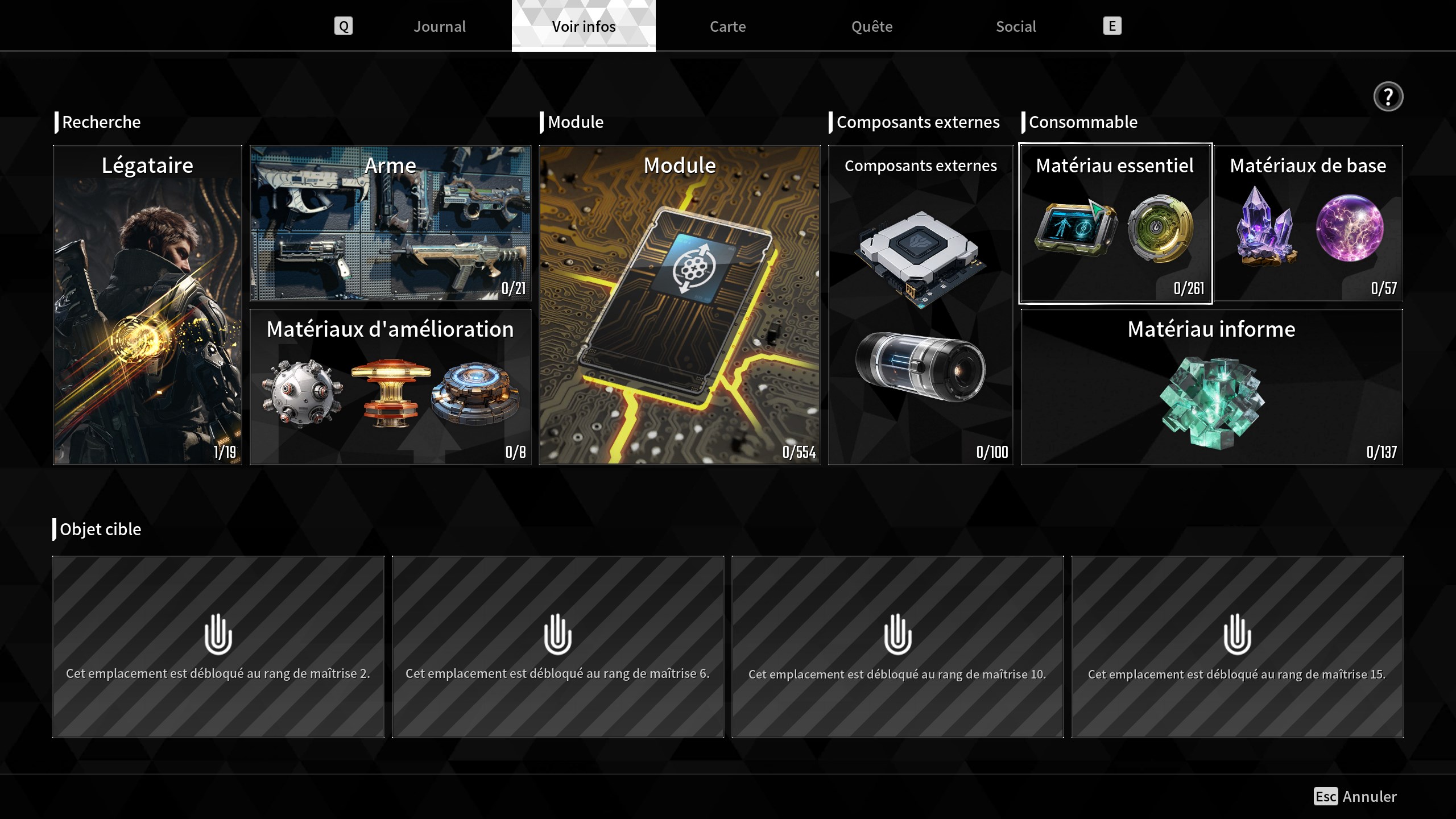 Pour connaître la méthode d’obtention de n’importe quel matériau dans The First Descendant, nous vous rappelons que vous pouvez ouvrir le menu Voir infos en cliquant sur M pour avoir accès