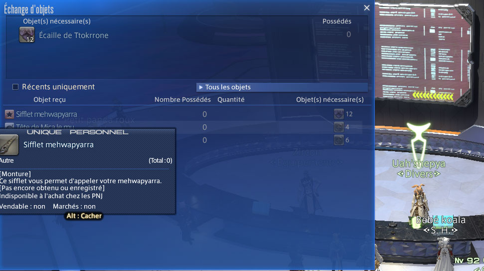Sélectionnez l’option « Objets » pour voir la monture disponible à l’achat. Malheureusement, la monnaie nécessaire pour acheter la Mehwapyarra est appelée Écaille de Ttokrrone, une ressource