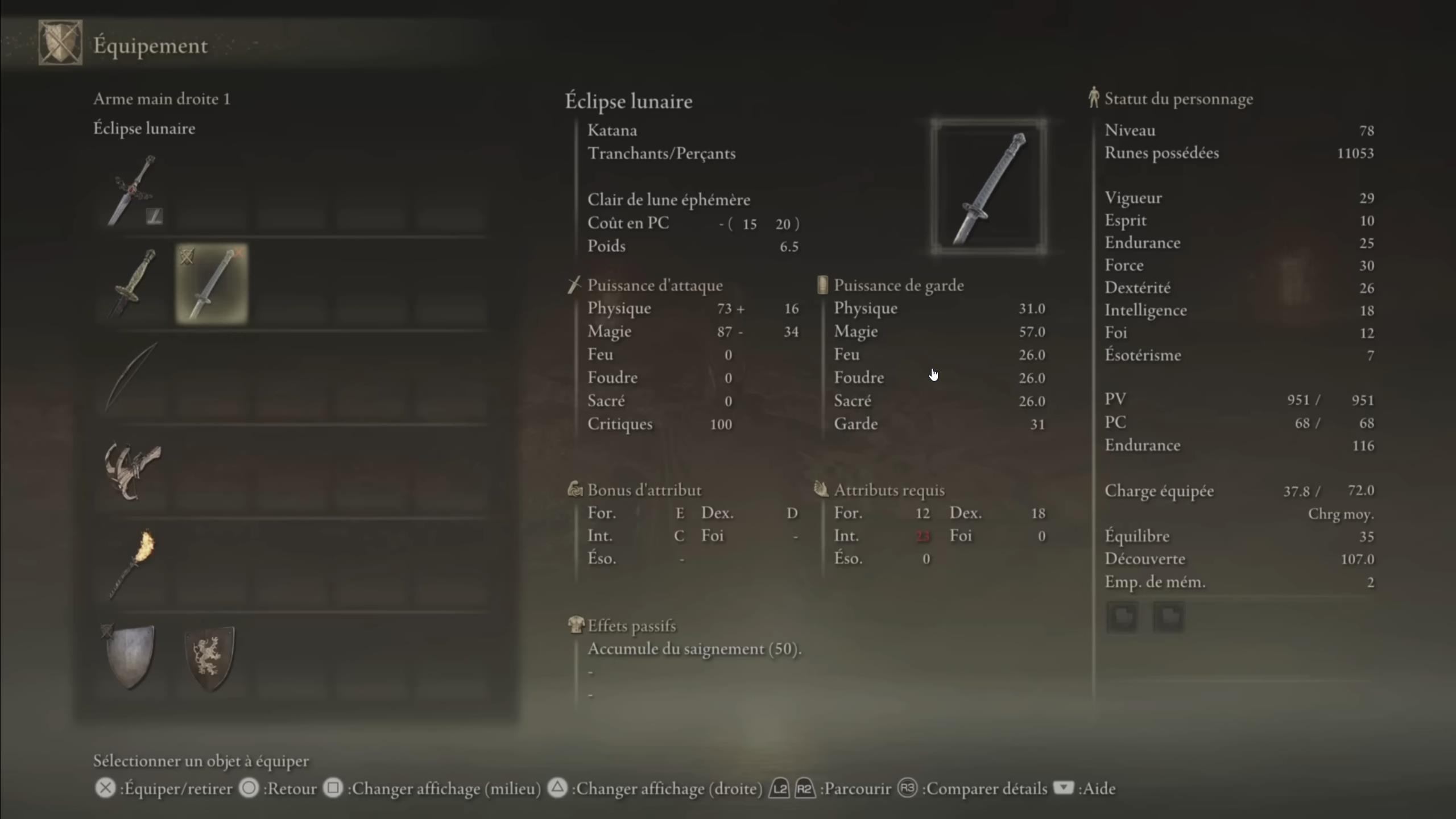 PlayStation et LT, puis RB ou RT sur les manettes Xbox. Il est à noter que cette arme fonctionne assez bien avec un build Saignement.