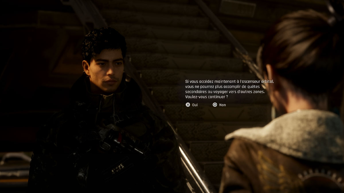 accédez maintenant à l’ascenseur orbital, vous ne pourrez plus accomplir de quêtes secondaires ou voyager vers d’autres zones. Voulez-vous continuer ?