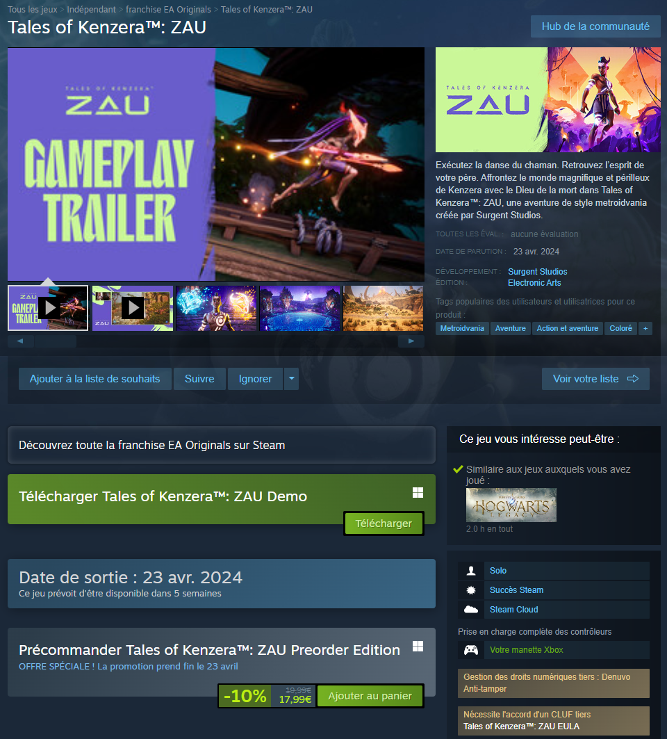 • Vous allez avoir le choix entre Tales of Kenzera ZAU ou bien directement la démo. Que vous choisissiez l’un ou l’autre, vous allez être redirigé sur la page du jeu sur Steam