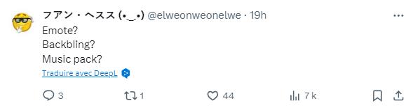 à dos, des planeurs ou bien encore des musiques ou des emotes comme le souhaiteraient certains joueurs sur X.