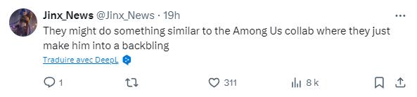 cette collaboration pourrait ne pas mener à des skins à cause de son apparence un peu spéciale, mais cela pourrait se faire par des cosmétiques divers comme des sacs