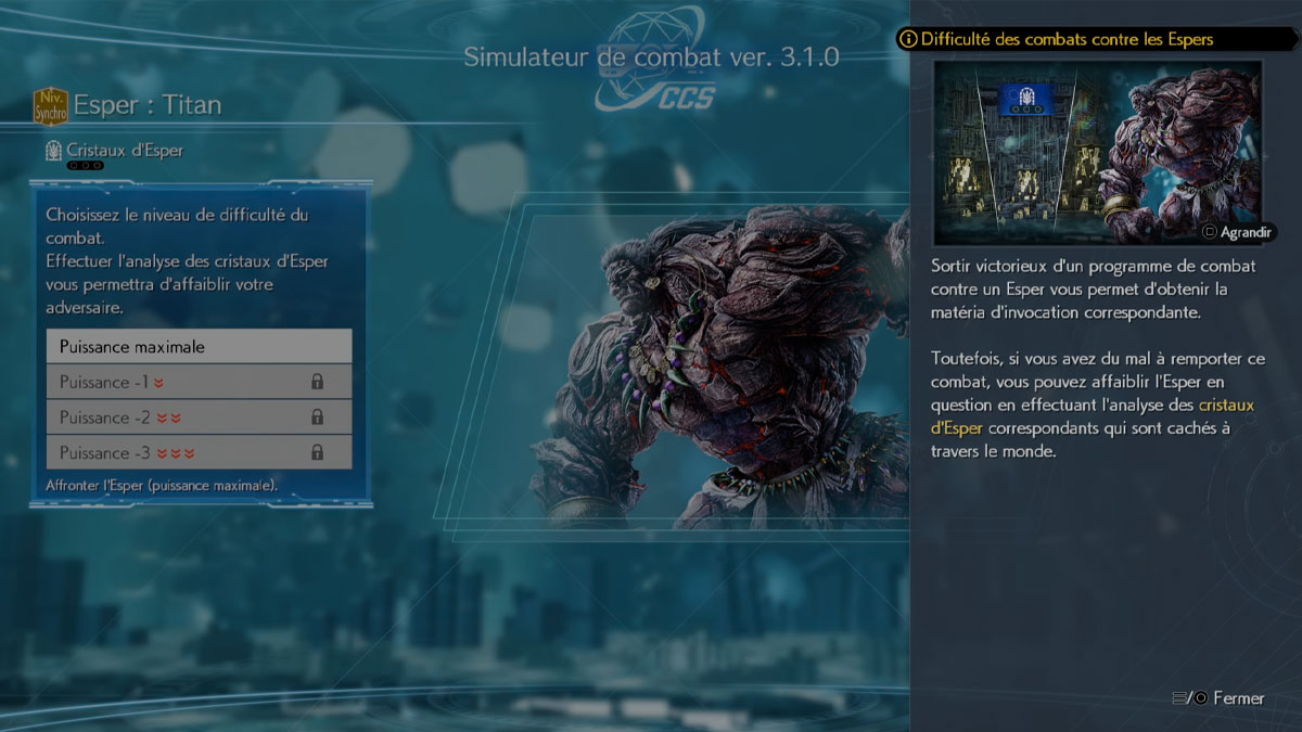 réduire sa puissance jusqu’à 3 fois, le rendant ainsi beaucoup plus simple à vaincre ! Nous vous conseillons de procéder de cette manière, car sans ses Espers Titan est redoutable.