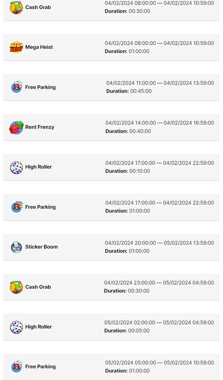 Toutefois, le wiki officiel de Monopoly GO! (source) informe de temps en temps des événements spéciaux qui sont prévus pour la journée et selon