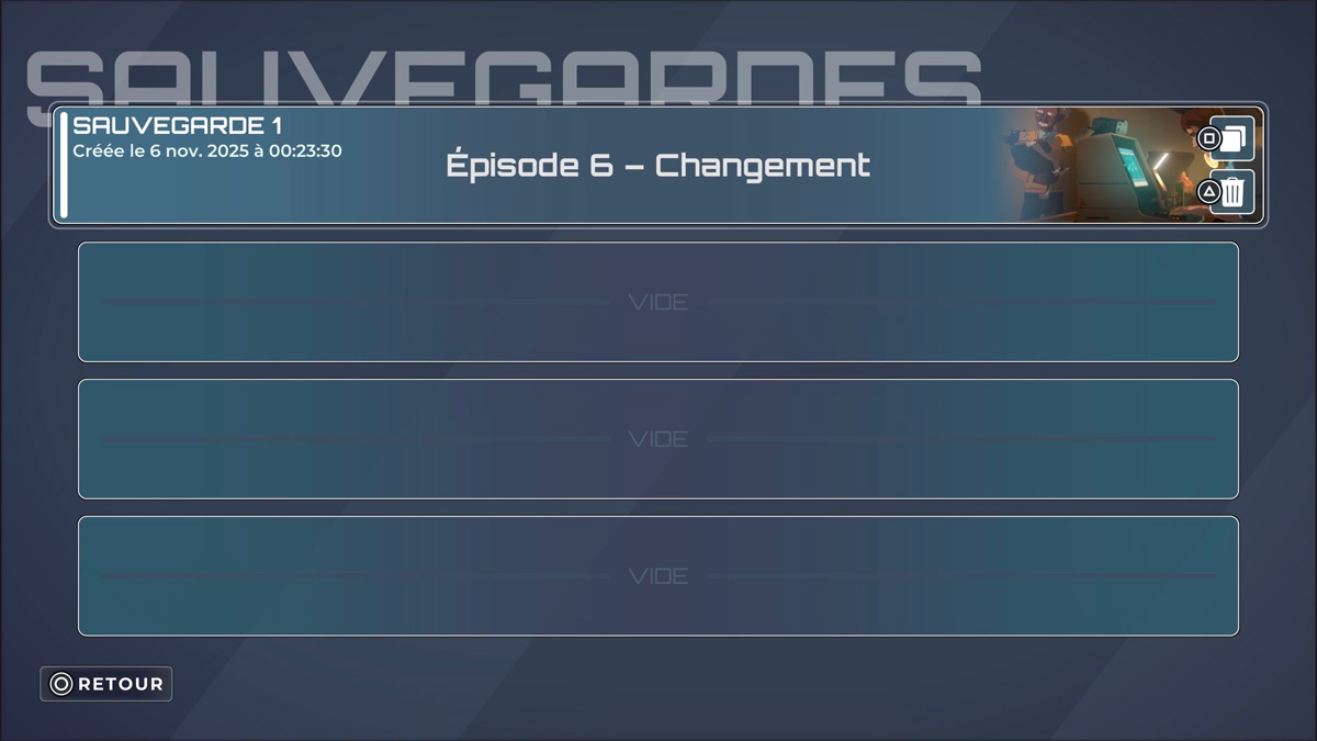« Sauvegarde« , accessible en appuyant sur S (PC) ou sur le pavé de votre manette DualSense (PS5).