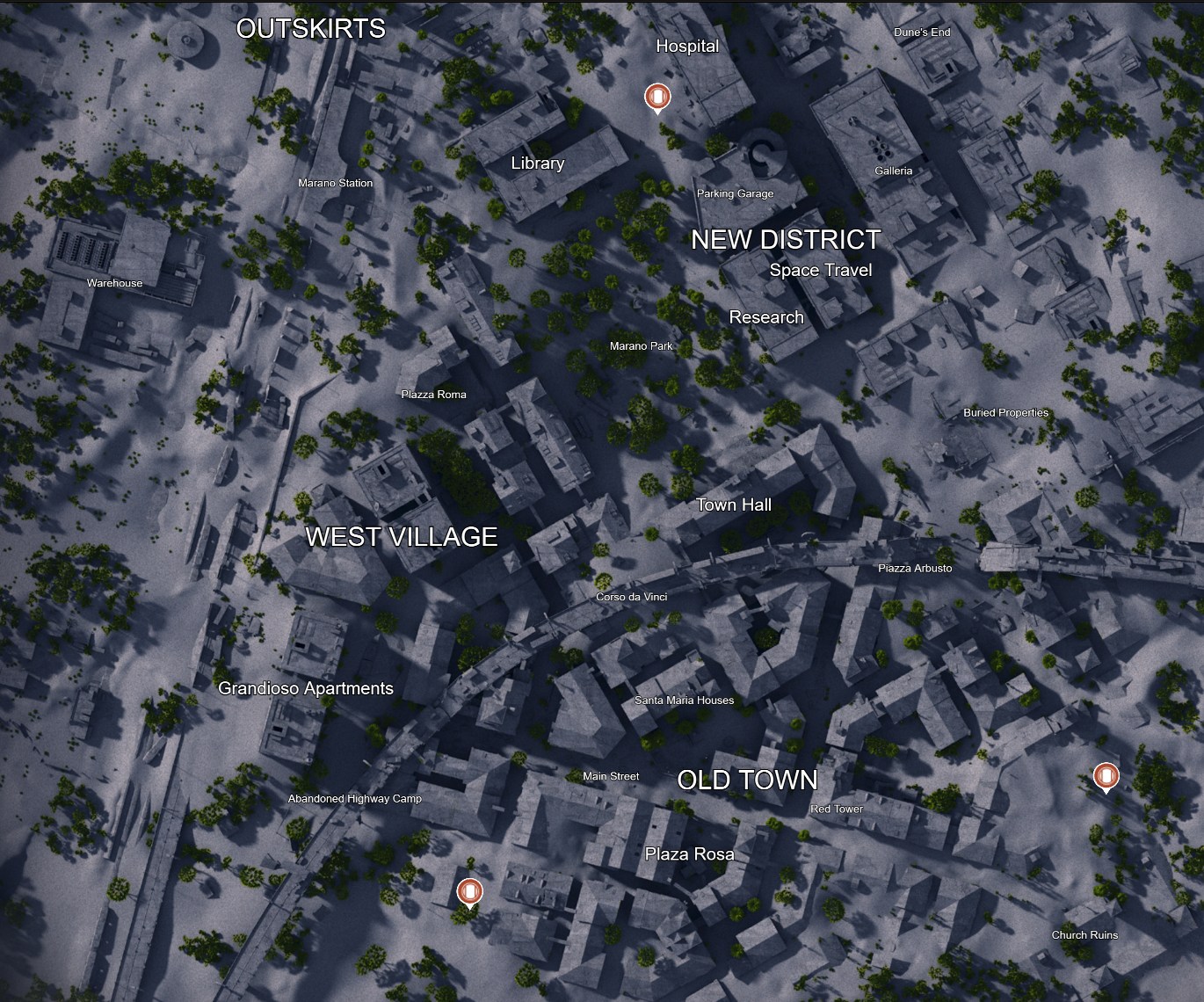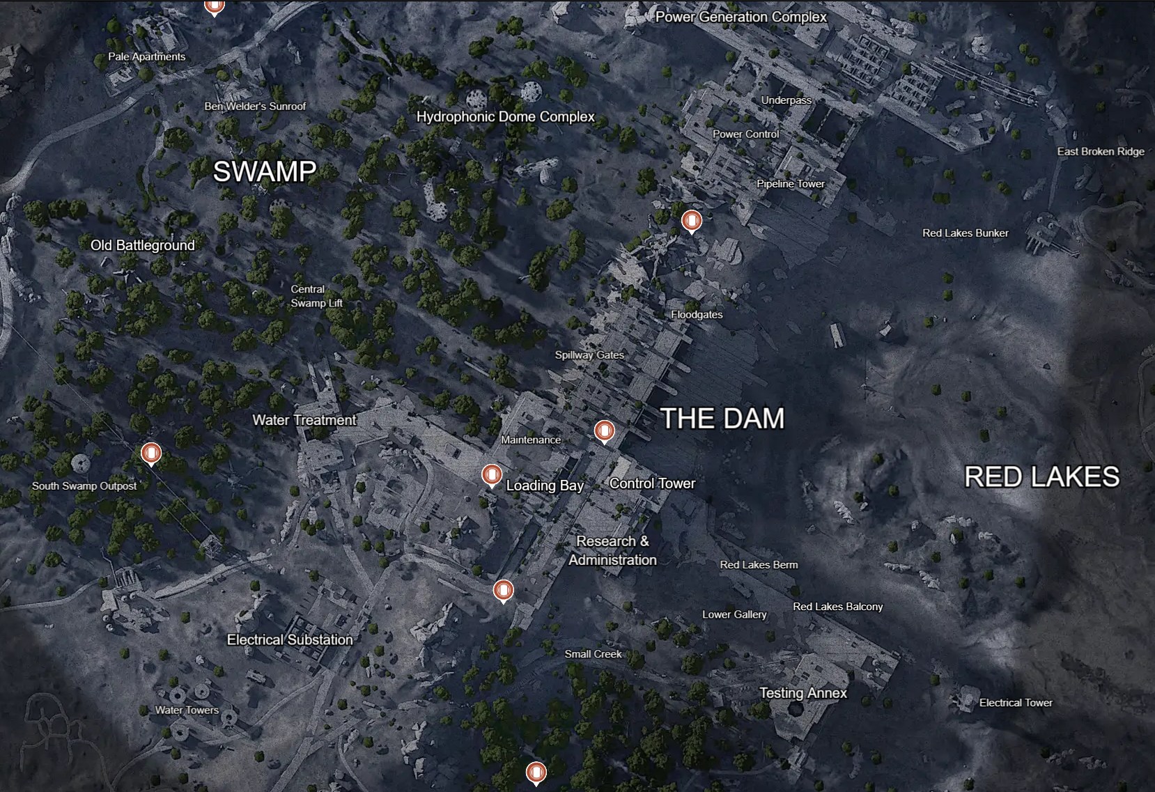 Emplacements des guetteurs au Barrage, ils sont représentés par les icônes orange – source image : Metaforge