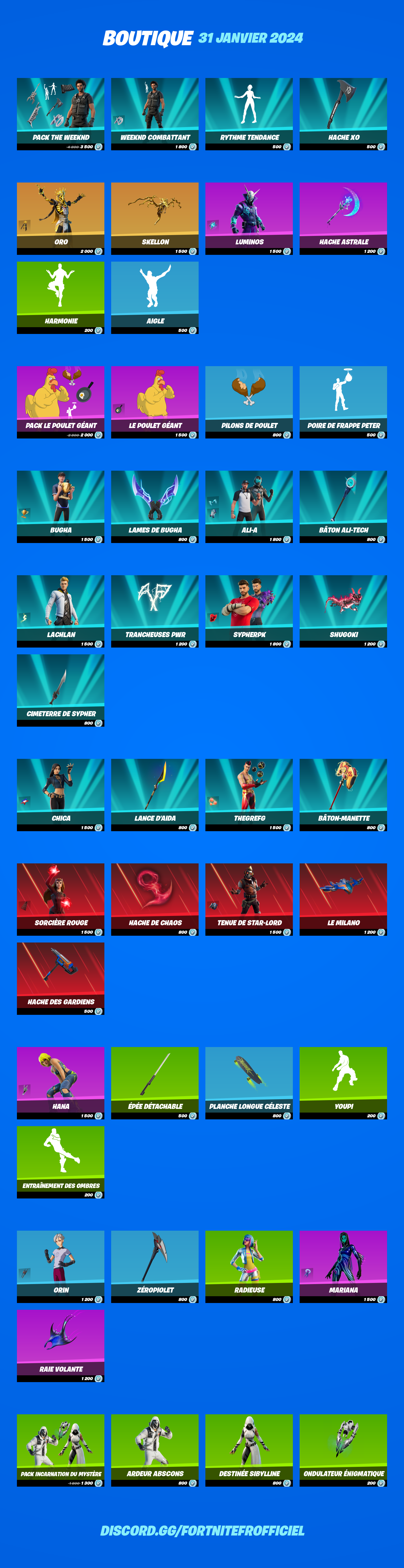 Voici la liste des skins disponible dans la boutique Fortnite du 31 janvier 2024.