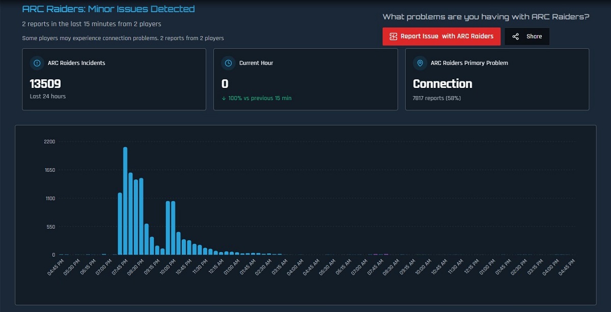 Ici, vous avez en temps réel toutes les informations nécessaires sur les serveurs d’ARC Raiders, avec le nombre de problèmes rencontrés par jour, le nombre de joueurs