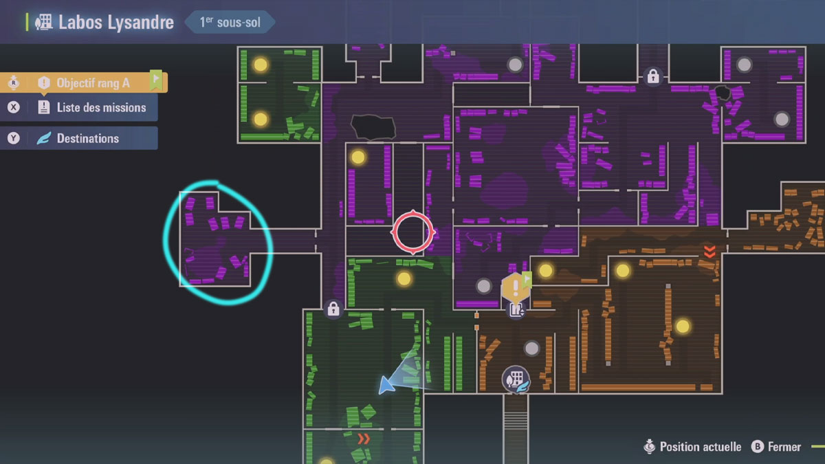 Une fois que vous avez parlé à Cendro et que vous pouvez entrer dans le Laboratoire Lysandre, dirigez-vous vers la zone violette située à l’extrême ouest de la