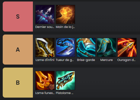 Voici les meilleurs items actuellement pour Samira. Il est important de garder à l’esprit que vous ne pourrez pas réussir à avoir ces items à chaque partie. Vous devez jouer avec ce que
