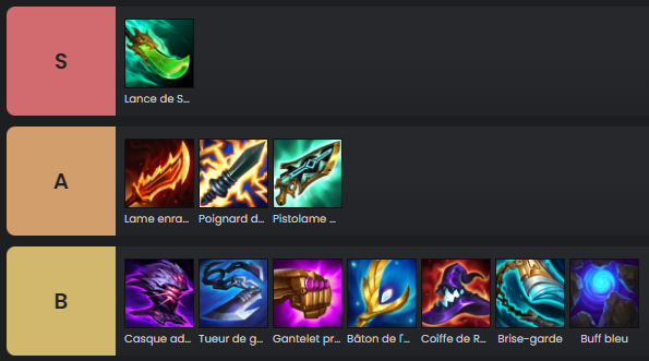 Voici les meilleurs items actuellement pour Nami. Il est important de garder à l’esprit que vous ne pourrez pas réussir à avoir ces items à chaque partie. Vous devez jouer avec ce que le