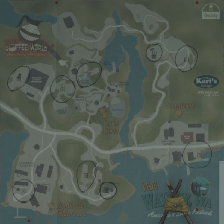 À un certain point de l’histoire, vous trouverez une carte sur un mur avec tous les emplacements des Caches Secte de Bright Falls. N’oubliez pas de l’inspecter