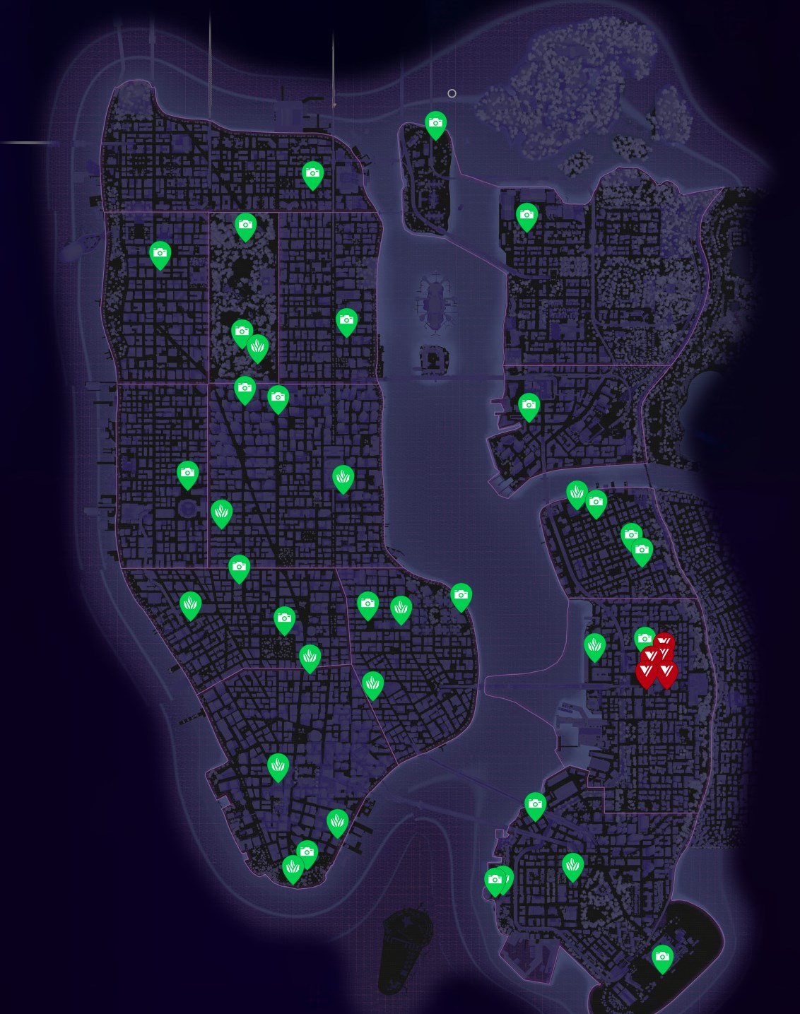 Emplacements des opérations photos, des souvenirs de Marko et des requêtes de Brooklyn Visions dans Spider-Man 2 – source : Mapgenie.io.