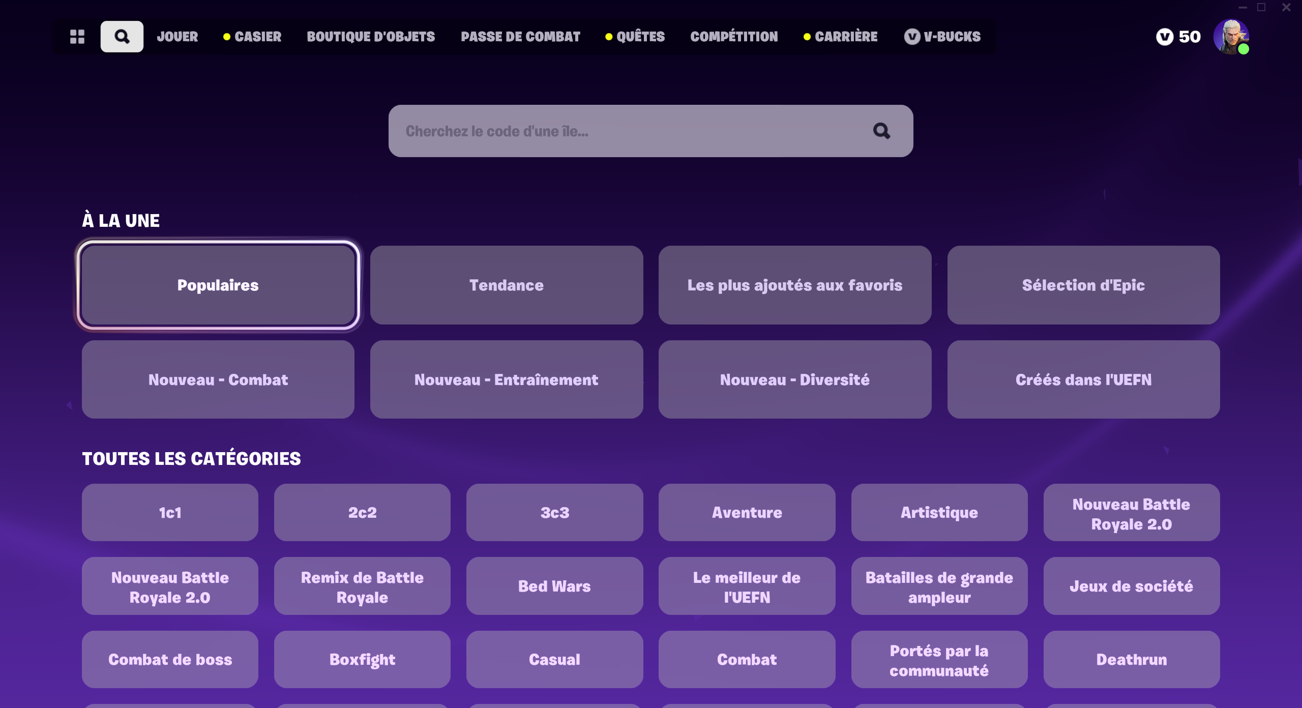 possible de trouver une expérience de créateurs qui vous convient en cliquant sur les différents boutons visibles sur notre visuel – source : Fortnite