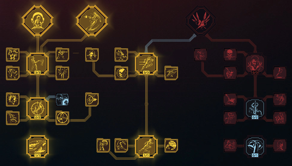 Pour terminer, on peut prendre quelques points en Intelligence pour jouer de notre longue distance en piratant ou jouer avec un Sandevistan et mettre tout ce qu’il reste en constitution.