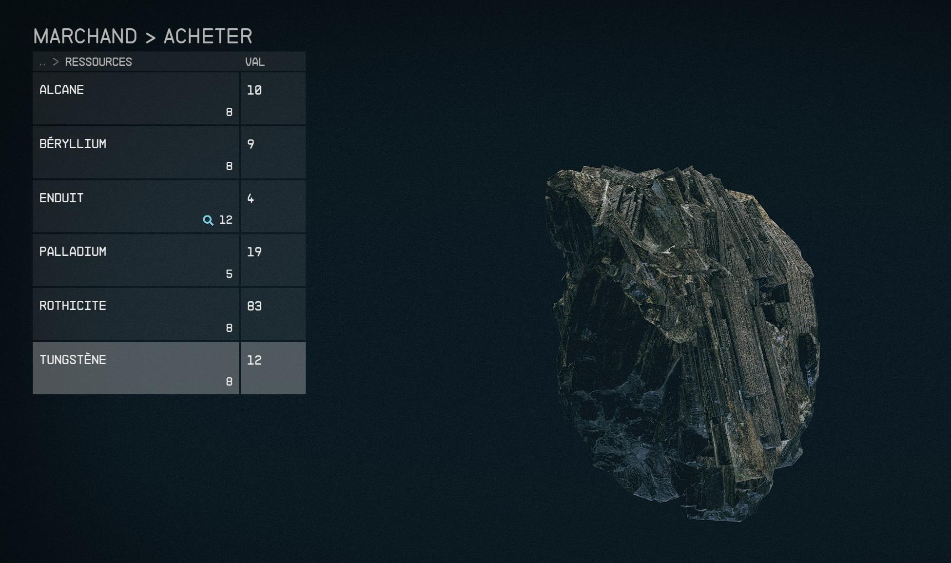 Le tungstène est vendu à 16 crédits l’unité et il vous faut vous rendre dans l’onglet Ressources du marchand auquel vous allez parler pour lui en acheter. Nous vous rappelons que