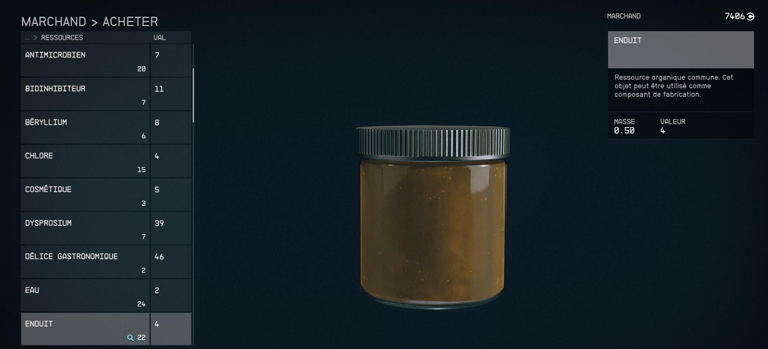 Les enduits sont vendus à 6 crédits l’unité et il vous faut vous rendre dans l’onglet Ressources du marchand auquel vous allez parler pour lui en acheter. Enfin, si vous souhaitez