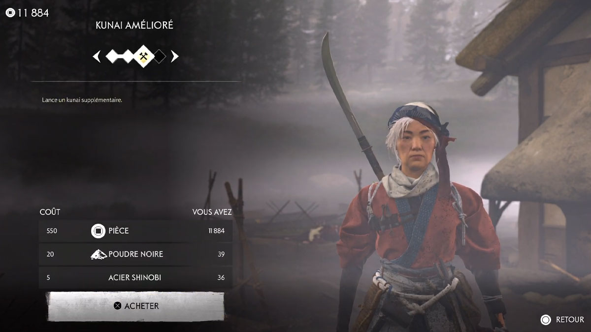 Après l’avoir débloqué, retournez voir Hana à sa ferme pour améliorer le Kunai. Elle propose deux types d’améliorations :