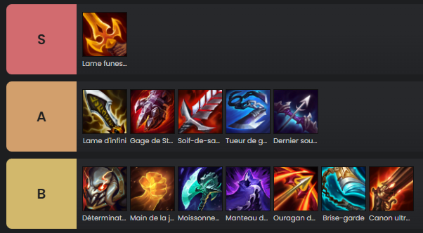 Voici les meilleurs items actuellement pour Naafiri. Il est important de garder à l’esprit que vous ne pourrez pas réussir à avoir ces items à chaque partie. Vous devez jouer avec ce que le jeu