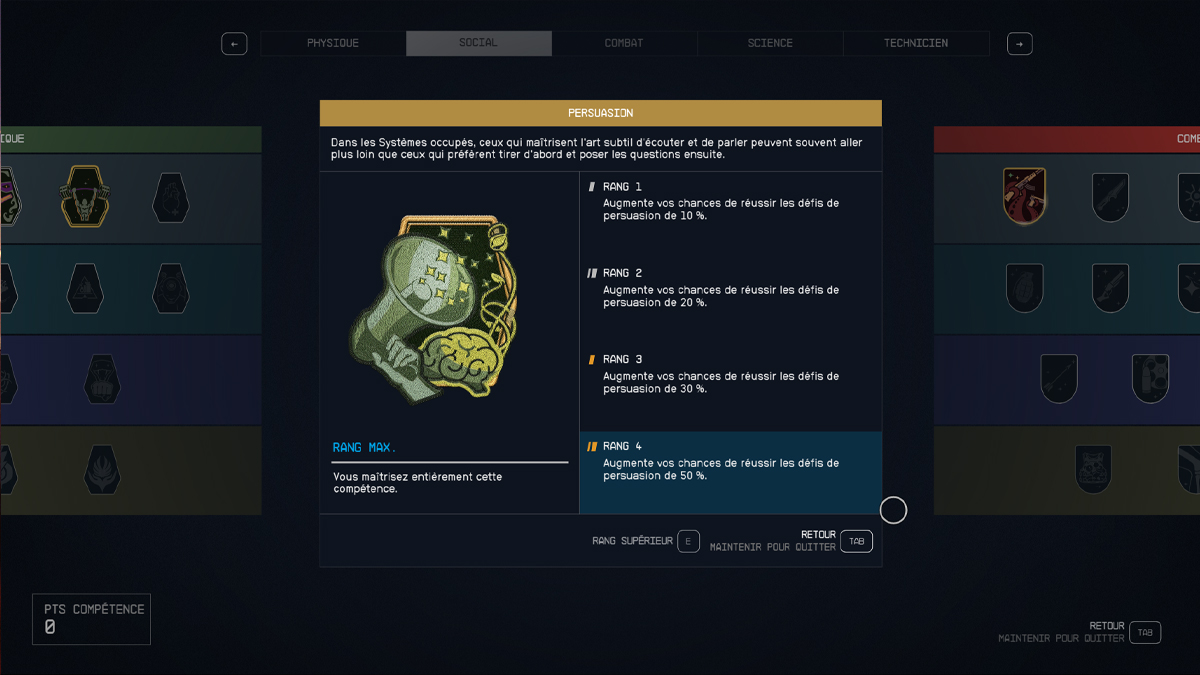 - Persuasion (Social) : Parlez-vous votre chemin à travers Starfield et économisez du temps, des crédits, et peut-être votre peau.