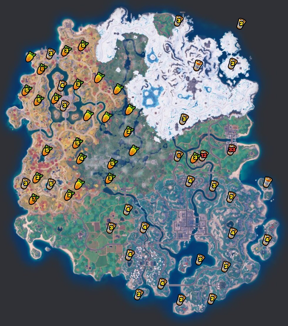 L’emplacement des barils et baies de Slap sur la carte de la saison 3 du chapitre 4 de Fortnite – source : Fortnite.GG
