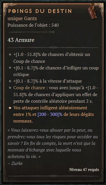 Voici l’effet des Gantelets: Vos attaques infligent aléatoirement entre 1% et [200 – 300]% de leurs dégâts