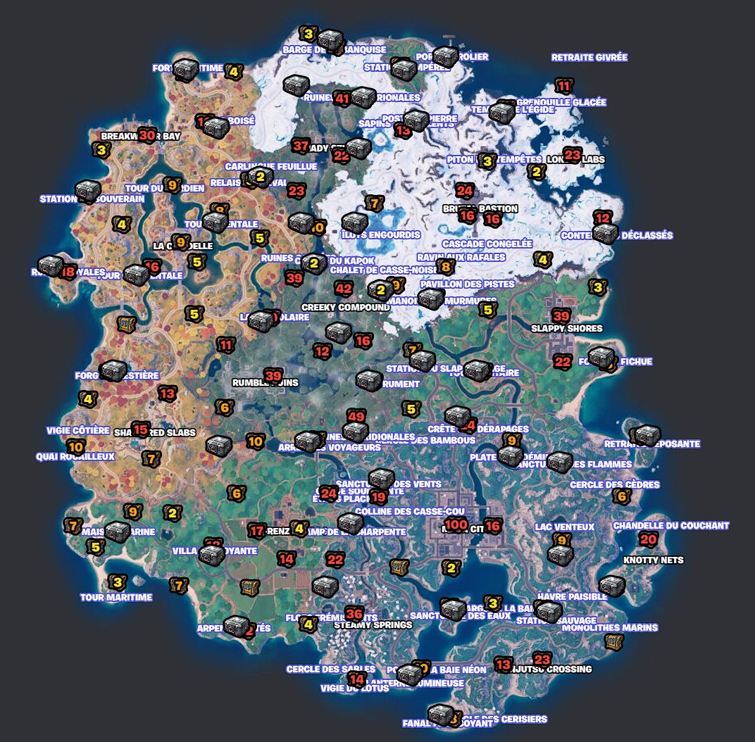 Emplacements des coffres et des holocoffres en saison 3 du chaptre 4 – source : Fortnite.GG