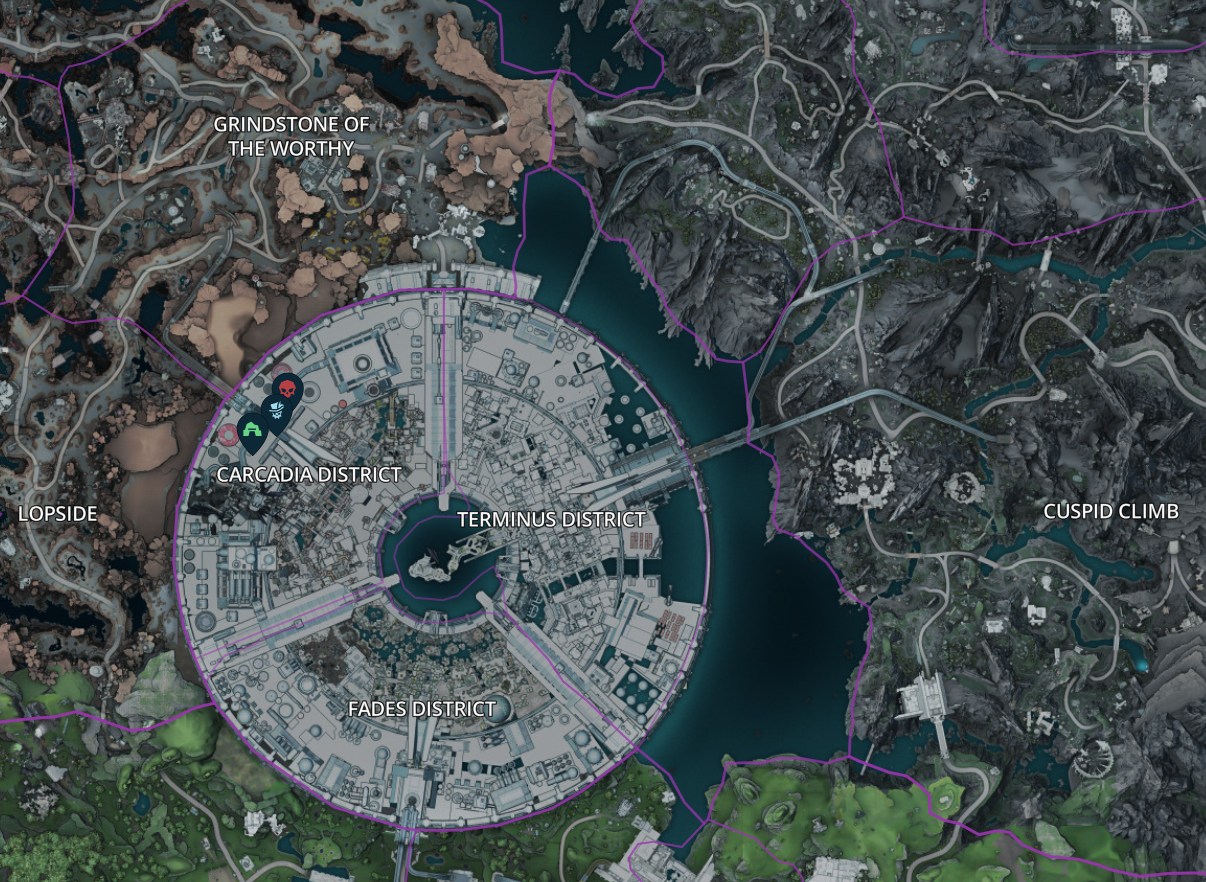 la carte dans la région du Quartier de Carcadia. Pour vous aider à le localiser, voici une carte basée sur la map interactive de Map Genie.