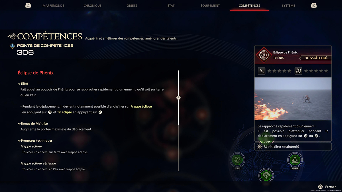 Flamme émergente est un classique puisque Clive commence le jeu avec. Clive invoque l’aile enflammée du Phénix pour projeter les ennemis devant lui vers le ciel, les embrasant et leur infligeant