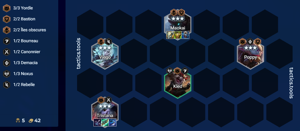 Votre priorité est d’obtenir Tristana / Maokai / Poppy / Viego 3 étoiles. Vous n’en avez besoin que de 3 des 4, Tristana incluse. Si par exemple