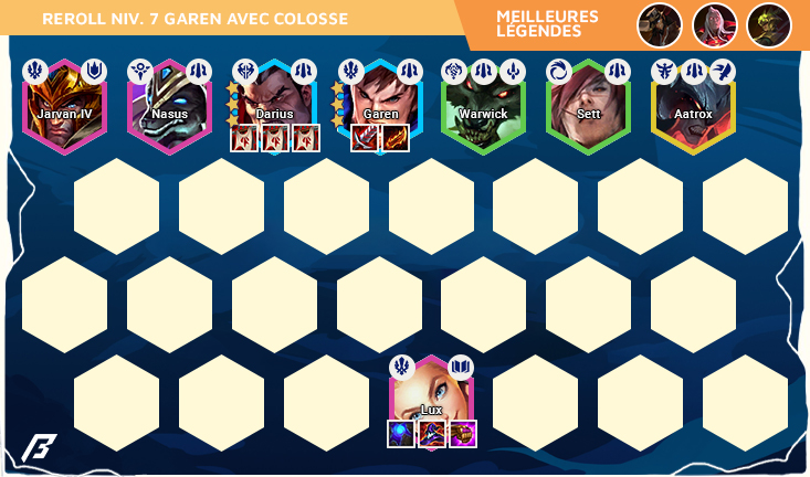 Garen est un très bon carry si vous réussissez à le passer niveau 3* accompagné de ses amis Colosses. Il a cependant besoin de conditions assez
