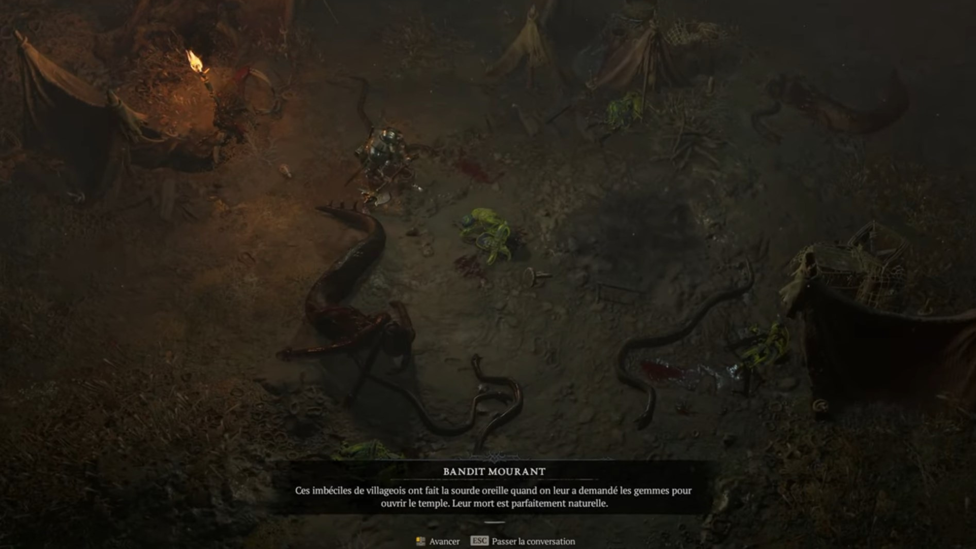 Pour trouver l’œil gauche, dirigez-vous vers le nord dans cette grande zone de quête et parlez à un PNJ survivant dans un camp