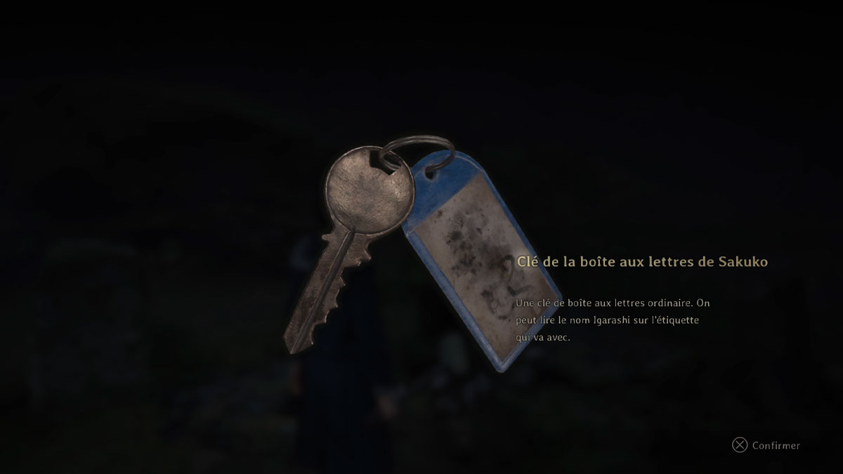 - Une fois en haut, regardez sur la gauche : vous trouverez à la fois la clé de la boîte aux lettres de Sakuko et une lettre de sa mère.