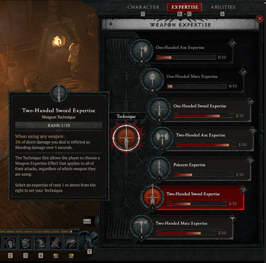 Pour ce build, nous allons équiper des épées à deux mains en priorité pour les effets de saignement et appliquer dans l’emplacement de technique l’expertise de