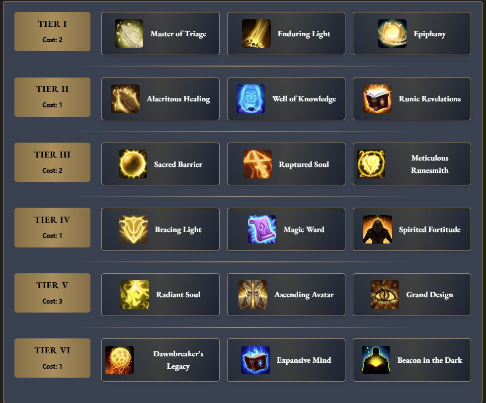 dans le support, il se distingue par sa mécanique unique des Runes Radieuses, qu’il génère avec des sorts comme Explosion Radieuse avant de les dépenser pour lancer des soins puissants ou des boucliers tels que Rune de Renouveau et