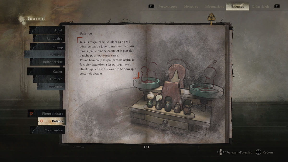 En arrivant dans une pièce de la maison d’Hinako, vous vous retrouvez face à un jouet qui est une balance. Avec cette dernière, vous apercevez cinq figurines que vous pouvez disposer sur la droite